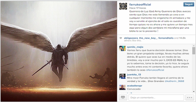 Así mismo el cantante señaló junto a la imagen: "Guerrero de Luz, God Army, Guerrero de Dios, a veces siento que Dios me está llamando. Yo creo que en cualquier momento me engancho mi armadura y me voy a servirle al ejército de él. Solo es cuestión de tiempo. Quizás no es ahora y me quiere un tiempo más aquí, pero algún día cambiaré mi micrófono por una biblia, lo sé, lo presiento".